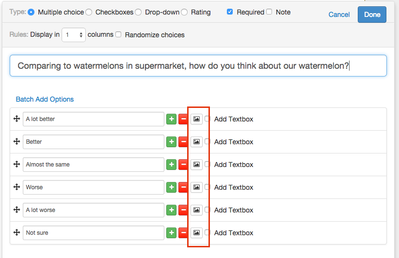 Click on the multi-choice question to turn it into edit mode. Then click on the Image button after each choice. Now you should see a pop-up window. Turn to My images tab to find or upload the pictures needed.