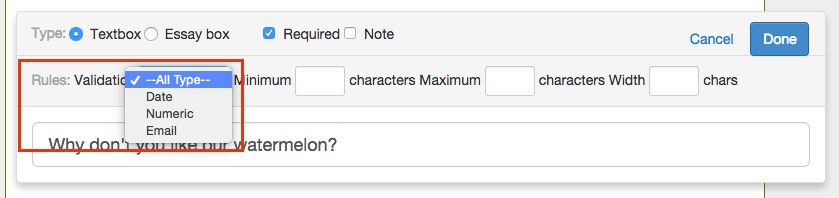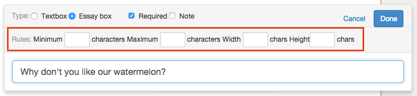Open end questions are used to collect respondents' opinions, thoughts or messages. You can set maximum or minimum characters or resize the text box.